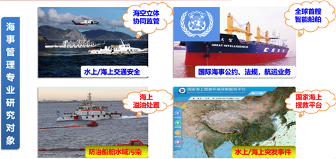 海事管理专业具有鲜明的现代智慧海事与安全应急科技特色,兼顾公共管理元素,突出海事安全保障、海洋环境保护、港航工程及航运业务等专业核心内容,注重树立海洋权益意识和提升海事科技及管理能力。