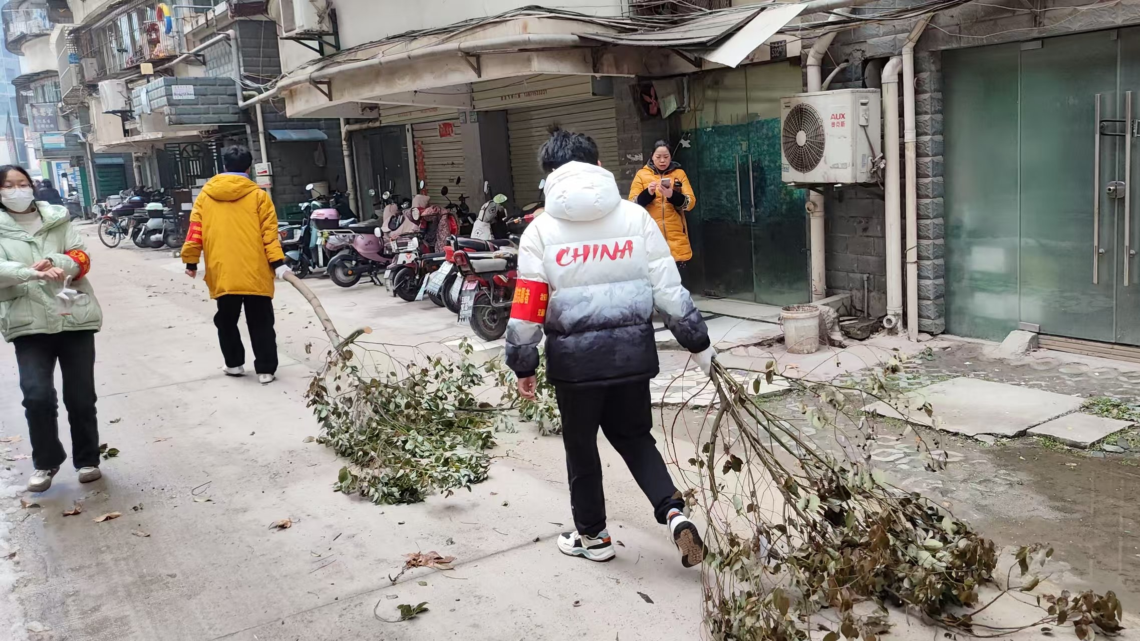 导航2302团支部走进洪山区纺织社区开展社区清洁活动。活动中,同学带好手套和口罩后分作两组,一组在工作人员的带领下进入楼宇清理楼道杂物,一组在社区人员带领下处理了乱摆乱放阻碍道路的杂物,拖走风雨之后掉落的树枝,并重点清理了外围的广告,使社区面貌焕然一新。