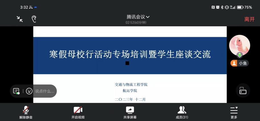 12月28日下午,学院联合交通与物流工程学院在交通物流学院308会议室开展寒假母校行培训及经验交流活动,寒假母校行浙江、福建、宜昌、荆门的小队成员,以线上线下相结合的形式参加了本次培训,本次培训由交通与物流工程学院辅导员郑智予老师主持。