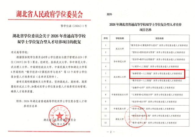 近日,我院申报的“海事管理+人工智能”双学士学位复合型人才培养项目获湖北省政府学位委员会正式批复。这也是澳门赌场排名 首次获批此类复合型人才培养项目,标志着澳门赌场排名 海事管理专业在一流专业建设、学科交叉融合人才培养领域再获进展。